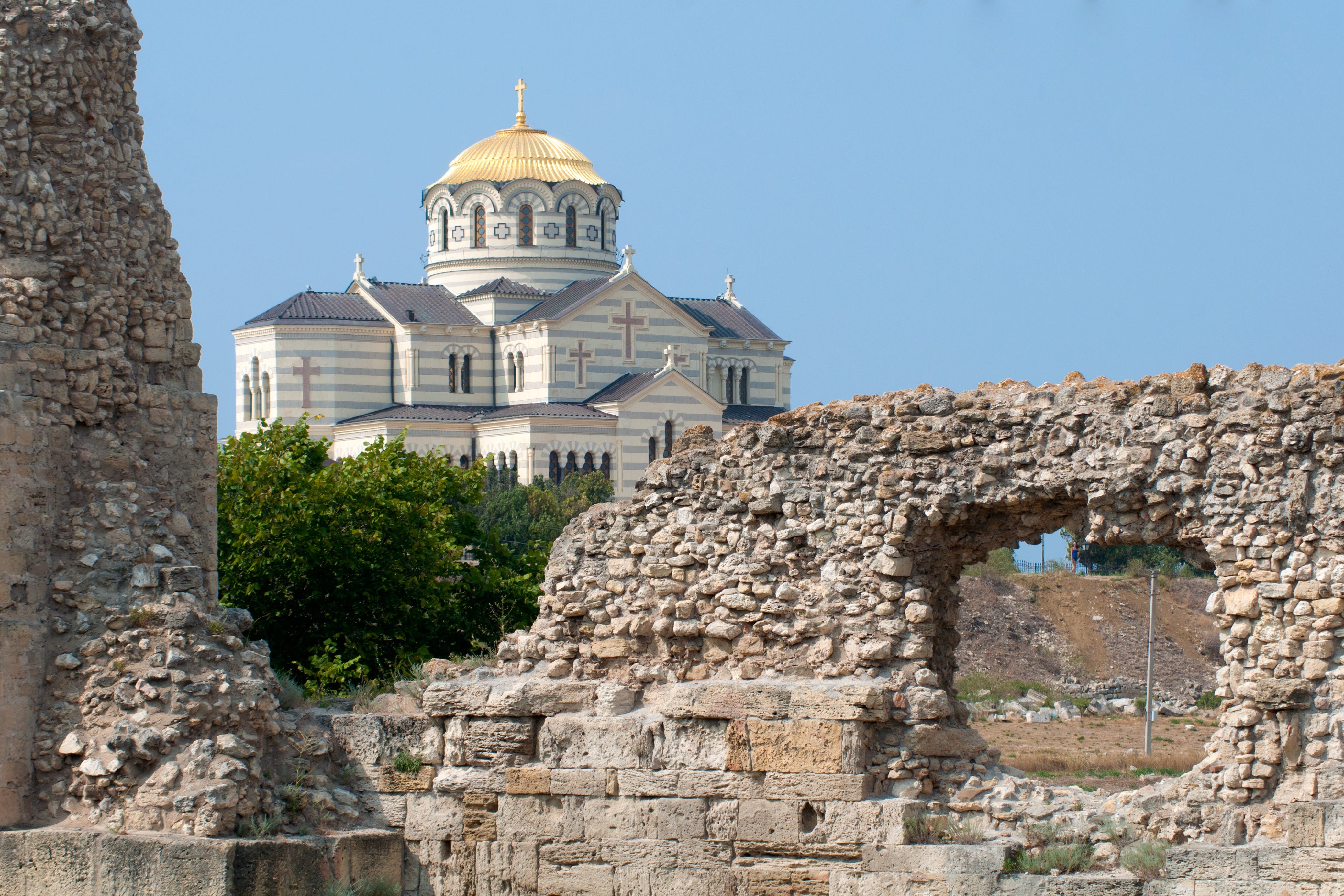 Зведення собору безпосередньо над археологічними залишками давніх базилік було не “відновленням”, а актом домінування. Це візуальне твердження: російська церква стоїть “на плечах” античності, ігноруючи тисячі років реальної історії кримських народів.