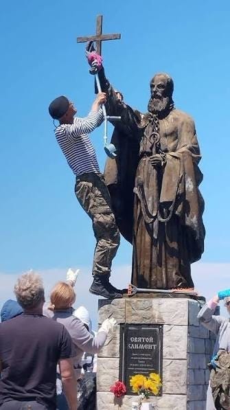 Методи XIX століття щодо сакралізації військової присутності набули гротескних форм під час сучасної російської окупації. У 2020 році в Козачій бухті під Ак’яром (Севастополем) окупанти встановили скульптуру Святого Климента, оголосивши це місце справжньою точкою його страти. Щоб надати міту вигляду науковості, чорноморський флот рф заявив про проведення “спеціальних гідрографічних досліджень”: за допомогою сучасних промірів глибин окупанти намагалися підтвердити церковну легенду про те, що море колись відступало на день пам’яті святого, оголюючи його підводну печеру-гробницю.