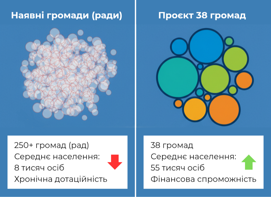 Нова модель — це не лише про карти, а про фінансову міць. Порівняйте: старі 250 рад мали в середньому 8 тис. жителів. Нові 38 громад матимуть в середньому 55 тис. осіб. Збільшення населення у 6–7 разів прямо гарантує зростання податкової бази та фінансову незалежність громад.